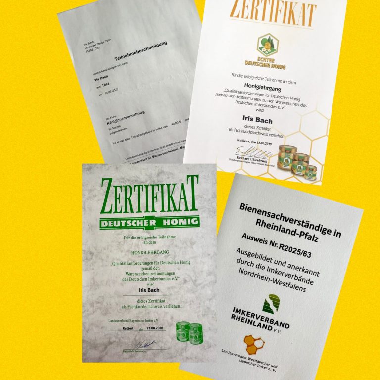 Von Beruf bin ich Fremdsprachensekretärin und Immobilienmaklerin. Für mein Hobby bin ich für die umliegenden Imker im Rhein-Lahn-Kreis als amtlich bestellte Bienensachverständige im Einsatz. Die Gesundheit der Bienen und Verarbeitung des Honigs liegen mir besonders am Herzen. Ein weiteres Steckenpferd ist die Königinnenzucht.
